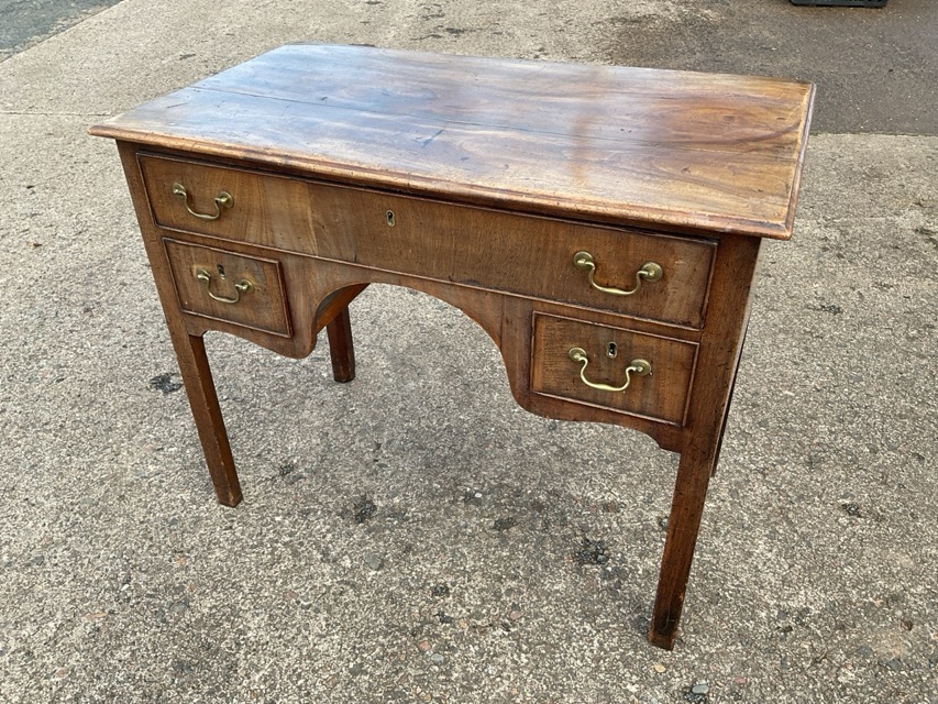 A Georgian mahogany lowboy with moulded rectangular top above a long frieze drawer and arched apron framed by smaller drawers, raised on chamfered square legs. (36in x 20.75in x 29.5in)