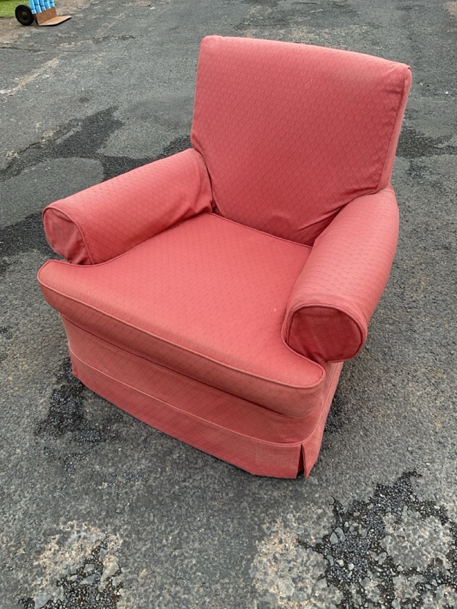 An upholstered armchair with rectangular back and seat with loose cushion flanked by outscrolled arms, raised on castors.