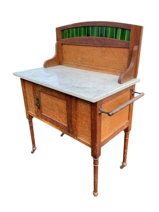 An art nouveau oak washstand, the back with arched tiled panel above a marble slab, the base with panelled cupboard, raised on turned legs with castors. (30.25in x 16.75in x 40.5in)