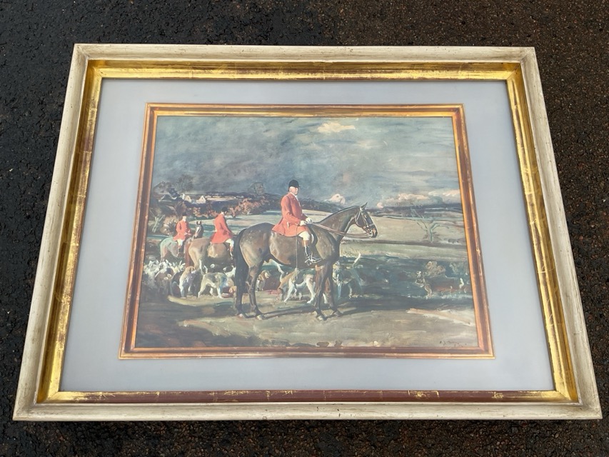 A J Munnings, facsimile print depicting huntsman & hounds in landscape, titled to Frost & Reed label verso Master of the Essex Union, signed in print, mounted & framed. (19.5in x 15in)