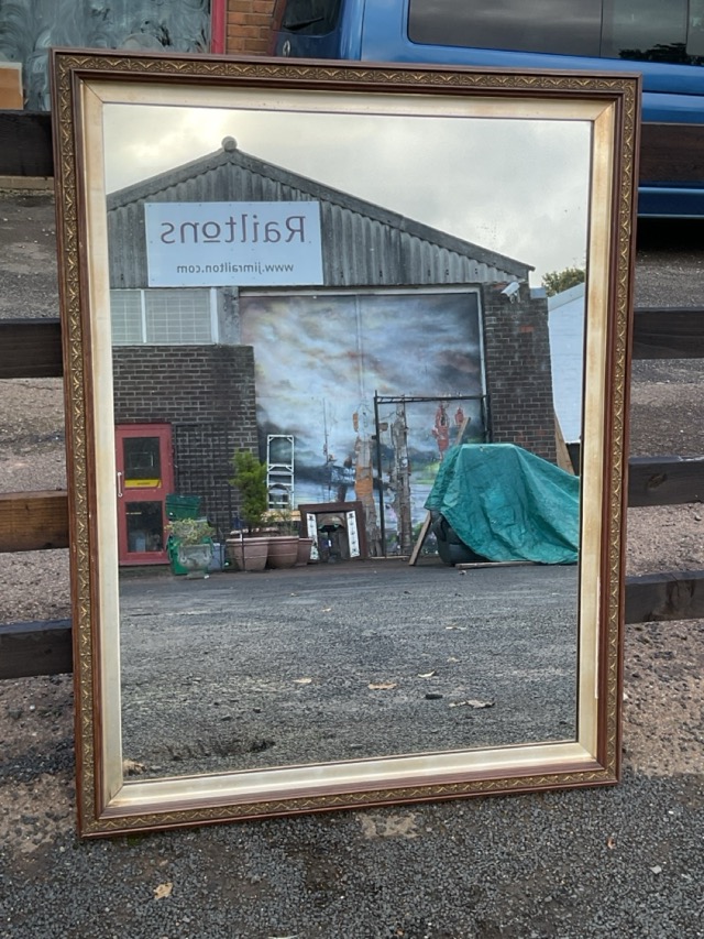 A large Edwardian rectangular mirror in moulded frame with gilt embossed band and silvered slip. (45in x 35in)
