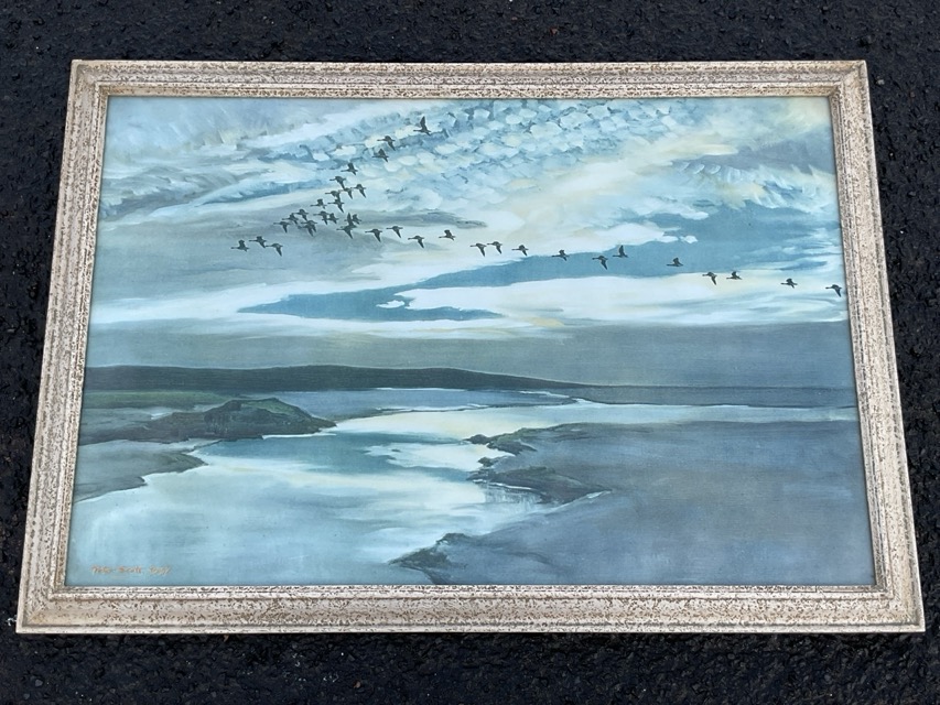 Peter Scott, coastal evening estuary view with geese, titled to verso Brent Geese Flighting under Mackerel Sky, signed in the print & dated 1937, framed. (23.5in x 15.75in)