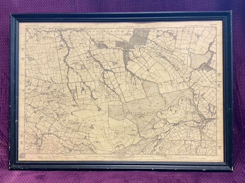 An 1868 Ordnance Survey map of Uldale in Cumberland, a reprint including Ireby, Caldbeck, Bolton Low Houses, Faulds Brow, etc., framed. (38in x 26in)