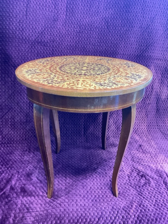 A Sorrento style circular musical sewing table with hinged top inlaid with scrolled foliage above a boxwood strung apron, raised on conforming tapering square cabriole legs. (16in x 16in x 17in)
