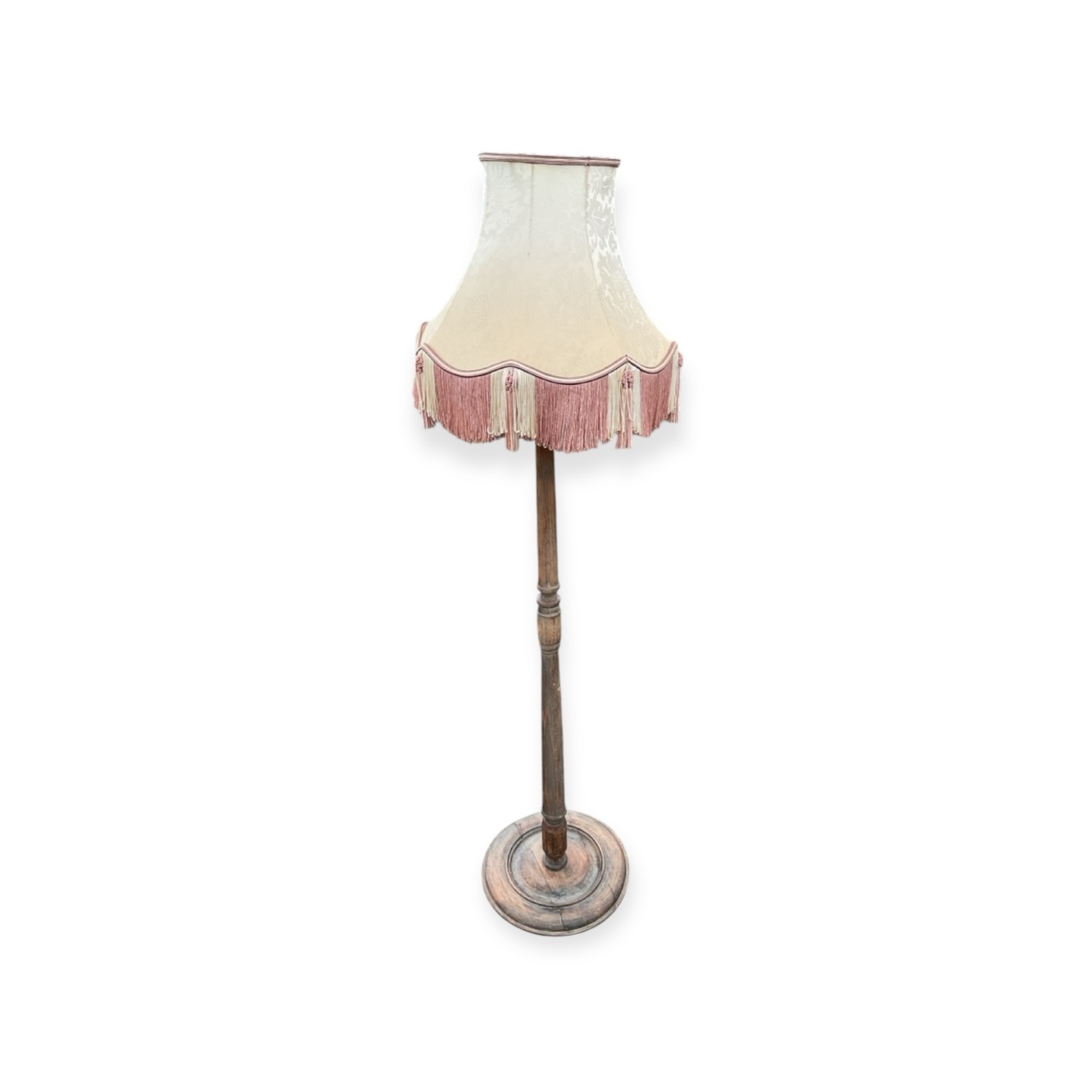 An oak standard lamp with turned column and circular base, mounted with fabric shade. (58.5in)
