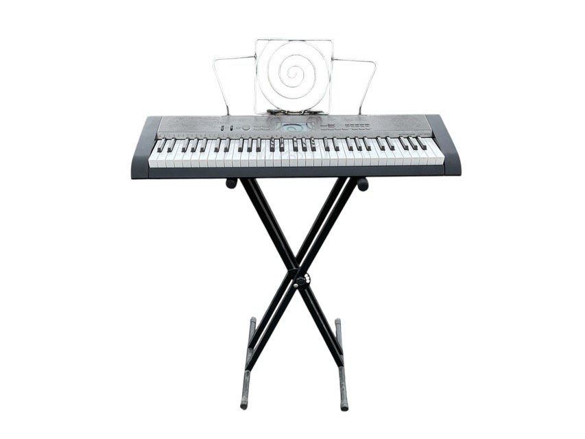 A Casio electronic four octave keyboard programmed with 50 rhythms and 100 tones, with chromed music rest on folding X-frame stand. (37in)