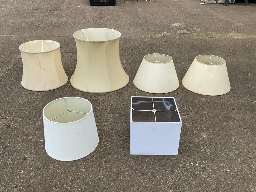 Two lined faux silk waisted standard lamp shades; a pair of smaller conical shades; and two others - square & tubular. (6)