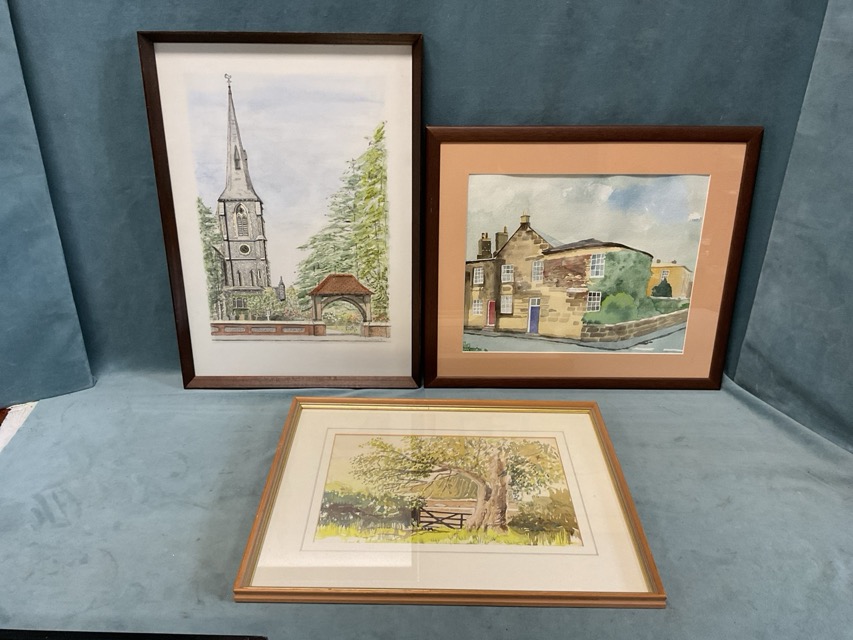 Allan Hanson, pen & watercolour, spired church with trees and arched gate; Jane Eggleston, watercolour, 1 Prudhoe Street, Alnwick; and RA Chapman, watercolour with tree and gate by a hedge, titled Frogmore Creek to label verso - all signed, dated and framed. (3)