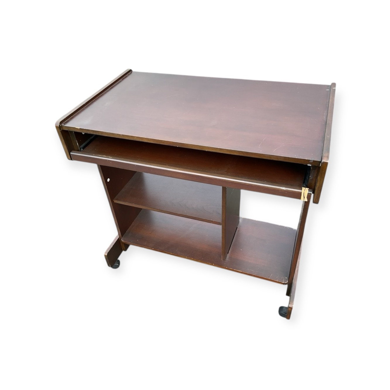 A mahogany computer desk with rectangular top above a sliding shelf and three open compartments, raised on battens with castors. (32in x 18.5in x 31.5in)