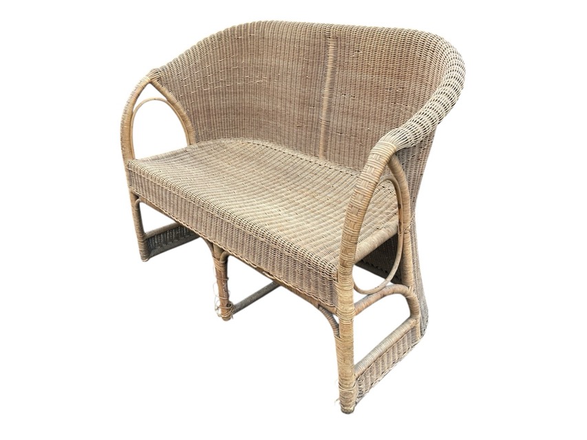 A cane sofa with rounded back and downswept arms framing open apertures, raised on cane-bound cylindrical legs. (41in)