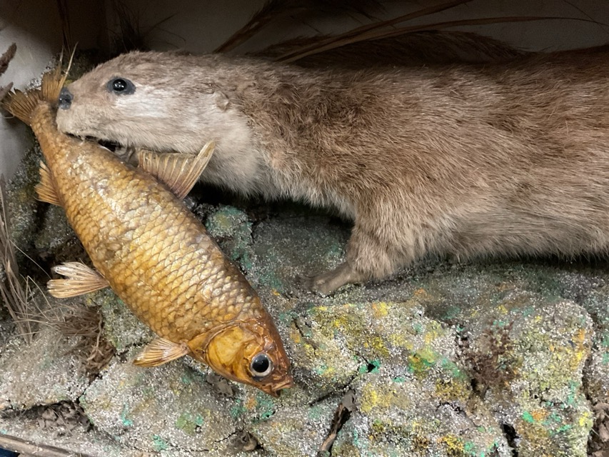 A cased taxidermy otter, the animal in naturalistic surroundings with fungus & foliage, having fish in its mouth. (43in x 10.75in x 15in)