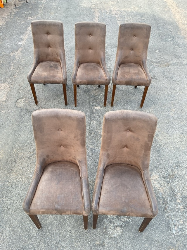 A set of five suede upholstered chairs with rounded button backs and shallow arms framing tapering seats, raised on square tapering legs. (5)