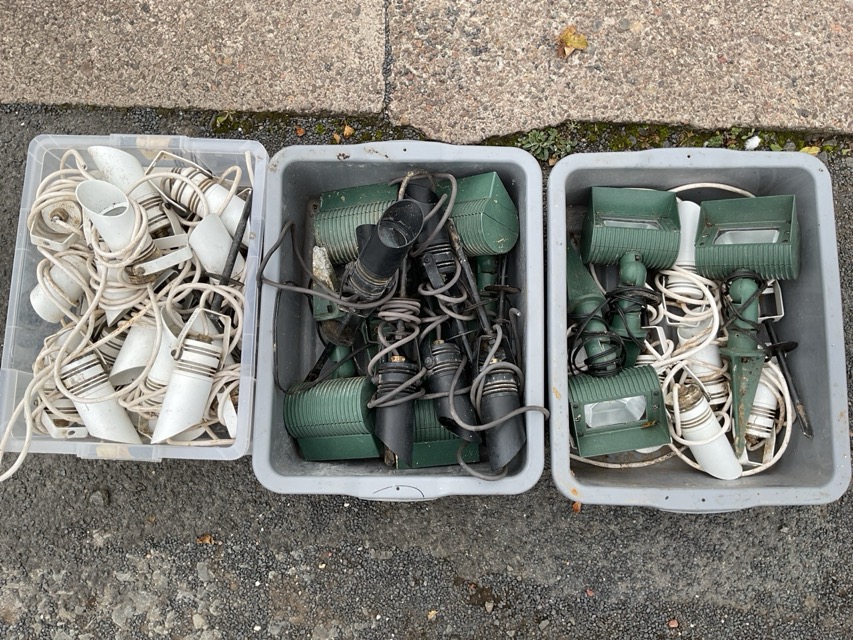Miscellaneous sets of outdoor lights with cables - tubular on brackets with stakes, ribbed floodlight type, etc. (A lot)