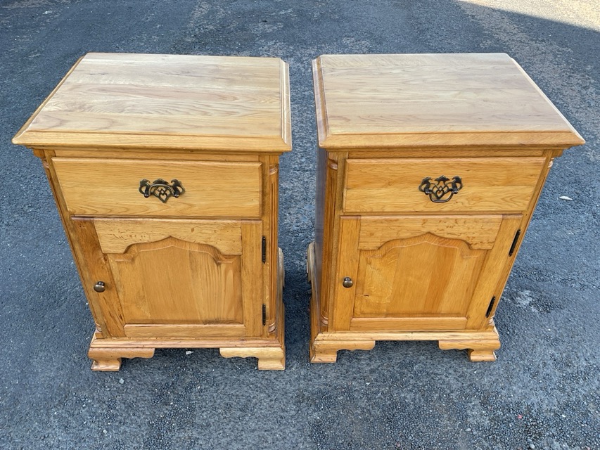 A pair of oak bedside cupboards having square moulded tops above drawers & panelled doors mounted with brass handles, flanked by fluted corner columns, raised on ogee bracket feet. (19.75in x 16in x 27.5in) (2)