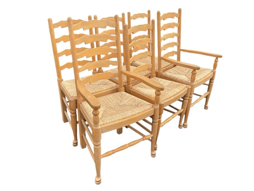 A set of six Victorian style beech ladderback dining chairs with rush seats, including two carvers having shaped arms, raised on turned tapering legs joined by stretchers. (6)
