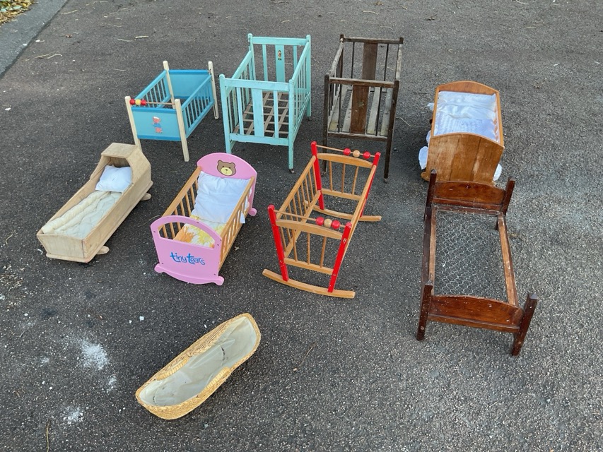 A collection of dolls and childrens beds & cradles - cots with slatted bases and rise-and-fall slides; a dolls bed with wire mesh base; cradles on rockers, two with play beads; a woven carrier with handles, etc. (9)