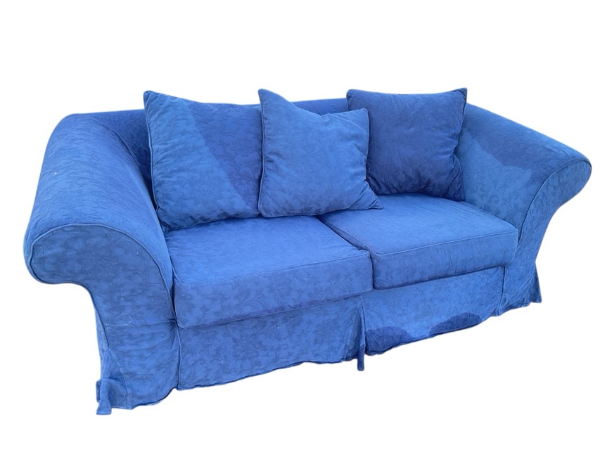 A traditional upholstered sofa with rectangular back and outscrolled arms above a rectangular seat with loose cushions and woven cotton covers, raised on cylindrical feet.