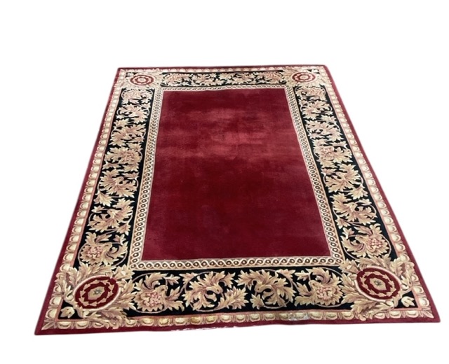 A Chinesewool Savonnerie style carpet woven with burgundy field within scrolled floral borders having oval corner medallions. (107.5in x 72in)