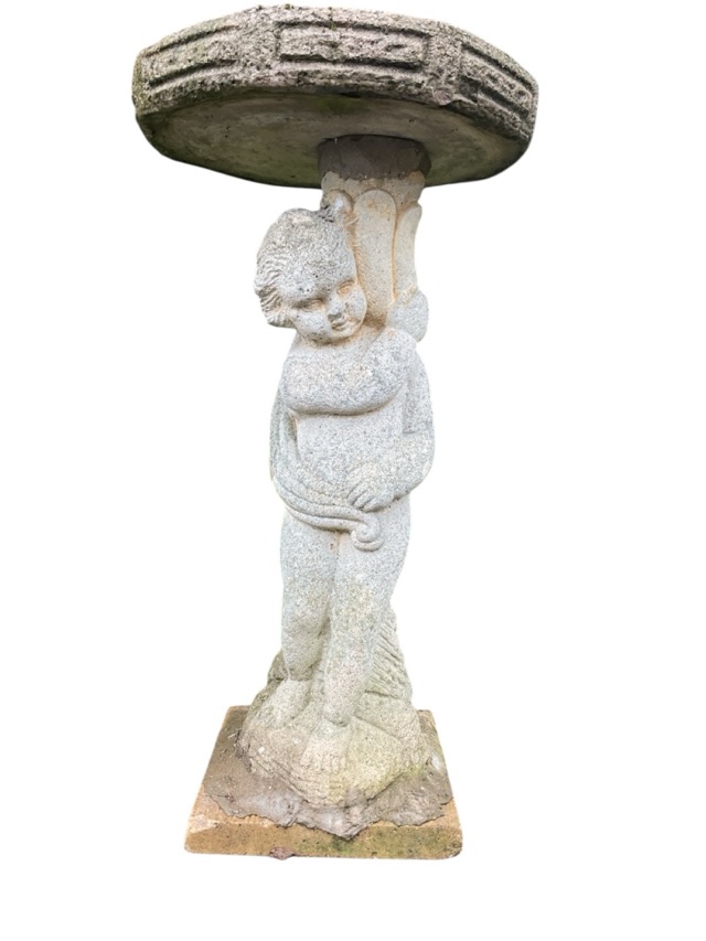 A composition stone garden birdbath with cherub holding cornucopia on square plinth beneath an octagonal bowl with panelled border - probably a marriage with repairs. (32.5in)