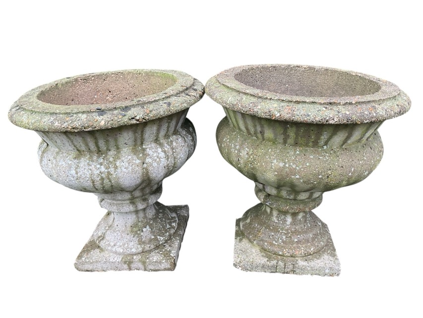 A pair of traditional composition stone garden urns with moulded rims and fluted bodies on socles with square plinths. (17in) (2)
