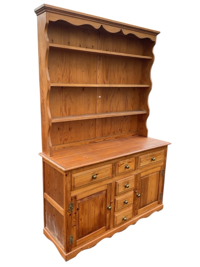 A Victorian style pine dresser with shaped apron above three plate shelves to delft rack, the base with six brass knobbed drawers and two fielded panelled cupboards. (54in x 18in x 81in)