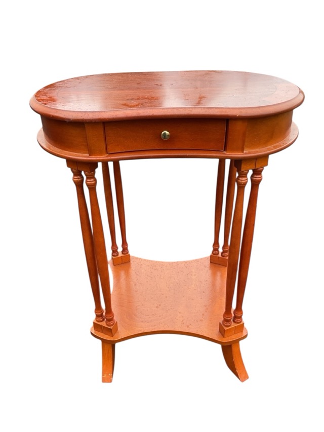A contemporary kidney shaped side table with crossbanded top and small brass knobbed frieze drawer supported on twin columns, above a waisted platform with splayed legs. (22in x 15in x 28.75in)