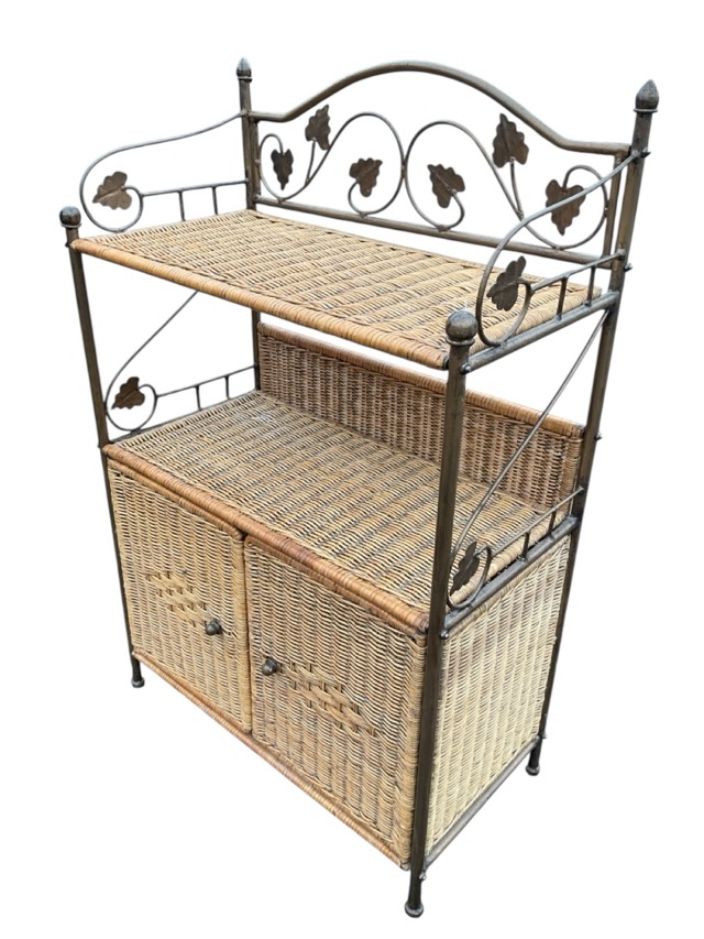 A canework side table on wrought iron frame with scrolled leaf decoration, having shelf above open compartment and twin-door cupboard. (24.5in x 12.5in x 38in)