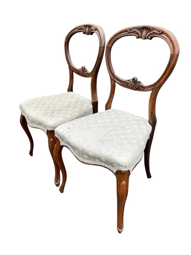 A pair of Victorian mahogany ballon-back chairs with scrolled carvings and stuffover upholstered seats, raised on cabriole legs. (2)
