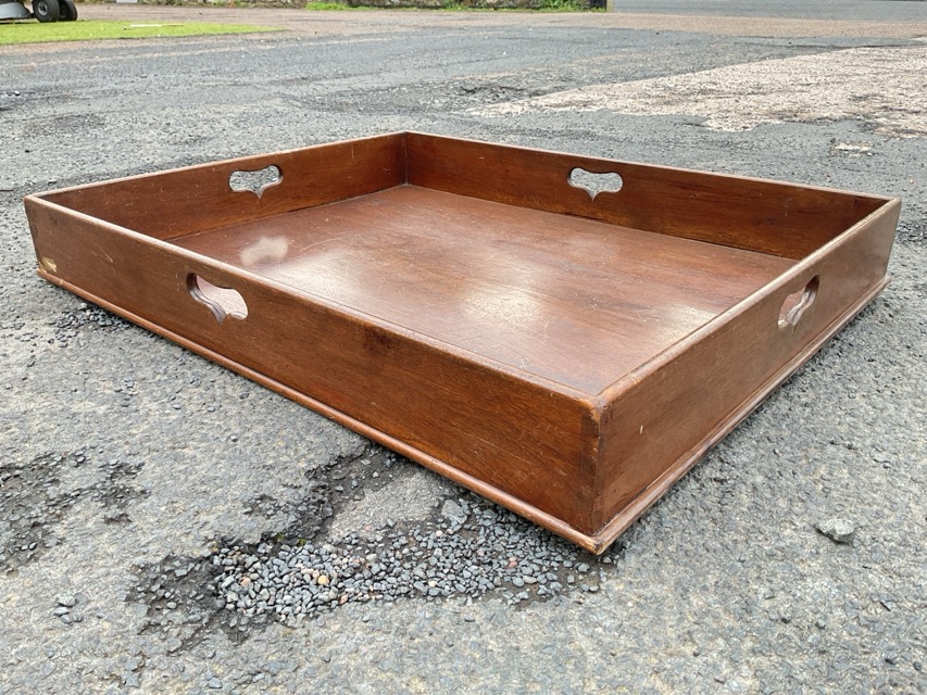 A nineteenth century rectangular mahogany butlers tray of dovetailed construction, having pierced handles to all four sides. (30in)