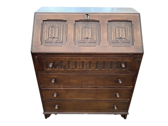 An oak bureau with linenfold panel carved fallfront enclosing a fitted interior, having four acorn knobbed drawers below, the top drawer with fluted carving. (29.75in x 16.5in x 36.25in)