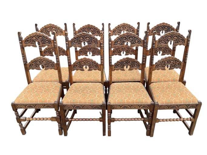 A set of eight Derbyshire oak dining chairs with scalloped arched scroll carved rails on tapering supports with applied split baluster mouldings, the stud upholstered seats above lunette carved aprons, raised on square legs joined by bobbin stretchers. (8)