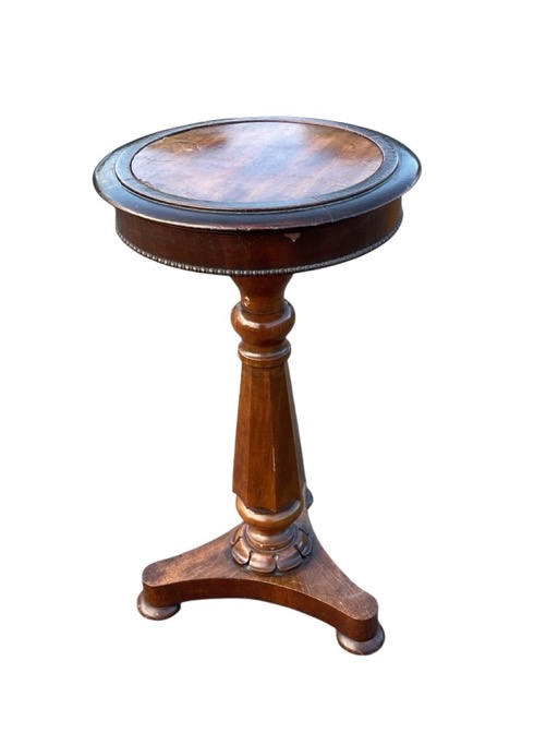 A George IV circular mahogany occasional table with well to moulded top above a frieze with lozenge trim, raised on an octagonal baluster column with lappet collar and triangular base with feet. (16.25in x 16.25in x 30in)