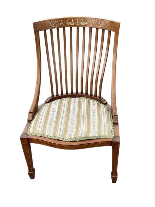 An Edwardian mahogany chair with foliate scroll swan marquetry to back rail above shaped lathes, the bowfronted seat on boxwood strung square tapering legs with spade feet.