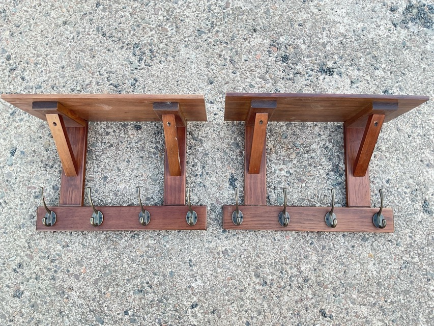 A pair of mahogany hall shelves with rectangular hat platforms on angled supports above rows of pegs. (18in) (2)