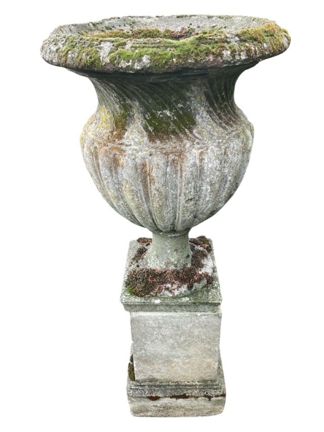 An old composition stone garden urn on stand, the vessel with fluted body beneath waisted gadrooned neck and egg & dart rim, supported on square column stand with moulded plinth. (40.75in)