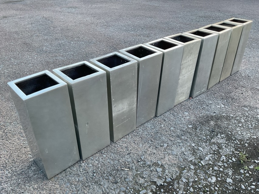 A set of ten plain square 2ft silvered resin stickstands or plantpots. (9in x 9in x 23.75in) (10)