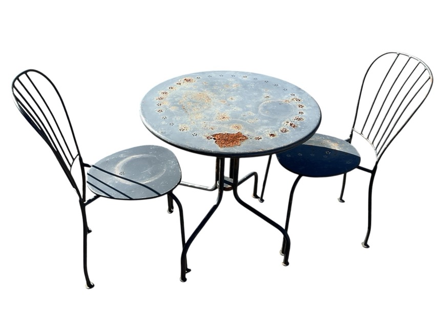 A circular garden table & chair set with pierced seats & top on rod legs with pad feet, the chairs with spade shaped backs. (3)