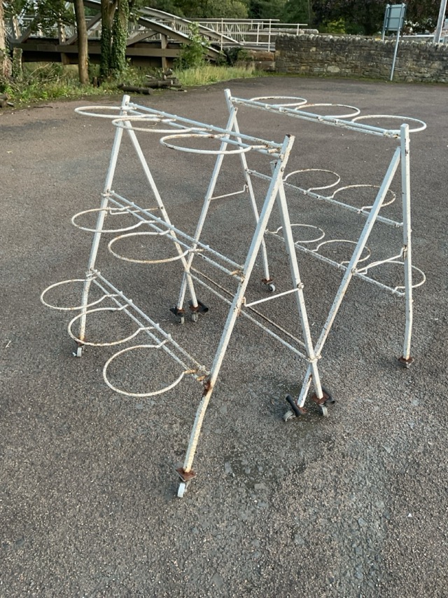 A pair of wrought iron folding flower bucket stands, each with three rows of hinged bucket-holders, the square supports on castors. (40in) (2)