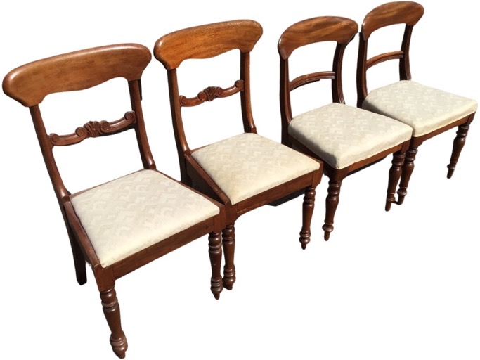 A pair of Victorian mahogany dining chairs, the shaped backs above scrolled carved rails, the drop-in upholstered seats raised on turned tapering legs; and another similar ninteteenth century pair. (4)