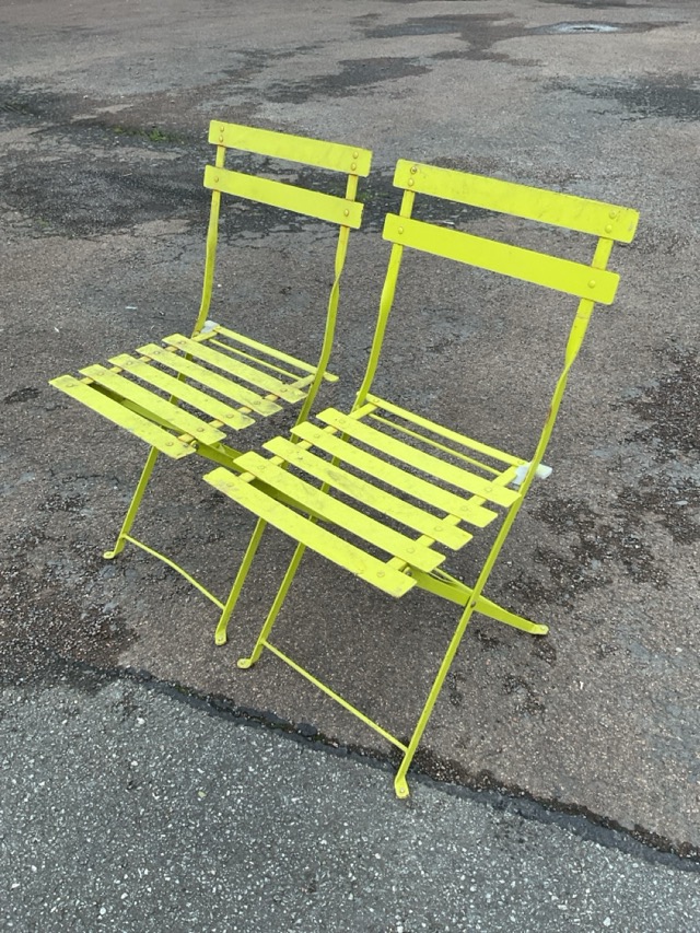 A pair of folding painted metal garden chairs with slatted backs & seats on rectangular legs with pad feet. (2)