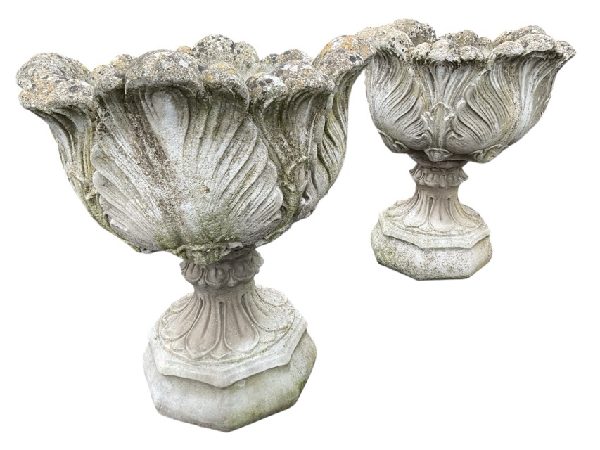 A pair of composition stone leaf cast garden urns on bulbous octagonal bases. (20in x 23.5in) (2)