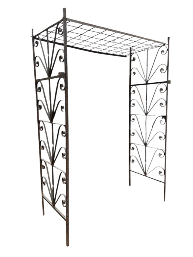 A 7ft wrought iron garden entranceway with two rectangular scrolled panels supporting square trelliswork roof. (66.6in x 30in x 92in)