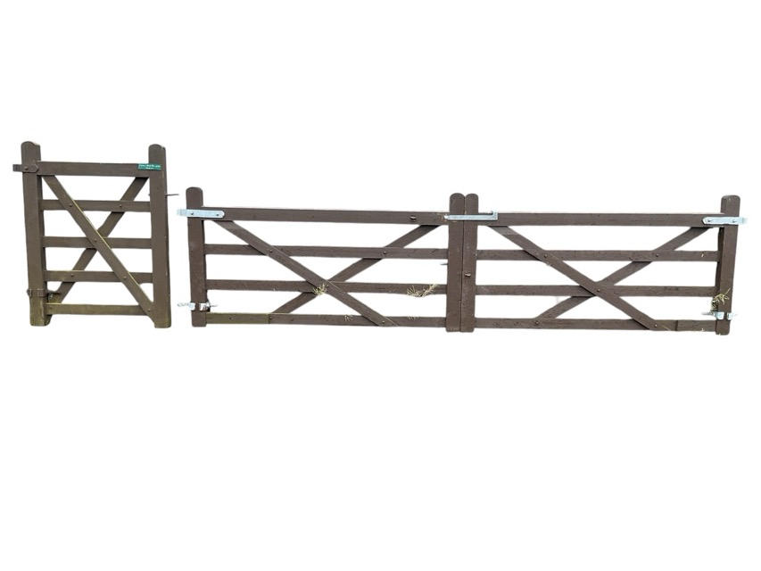 A pair of 6ft wood driveway gates of traditional construction having galvanised hinges & fittings - 12ft span; and an associated 3ft five bar side gate. (3)