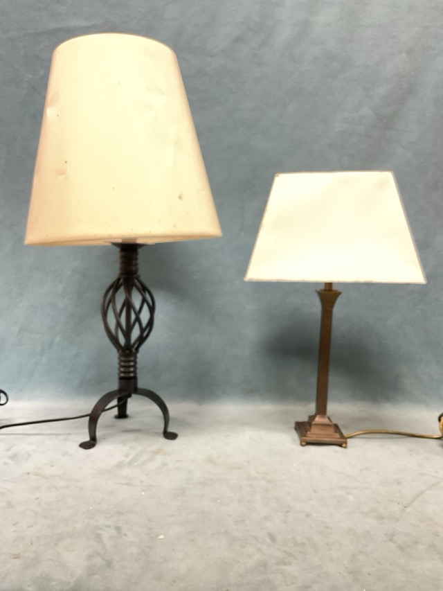 A wrought iron tablelamp with spiral cage raised on a tripod base with arched legs, and a conical fabric shade; and a deco style patinated brass tablelamp with square column ob stepped base raised on ball feet, with tapered rectangular shade. (2)