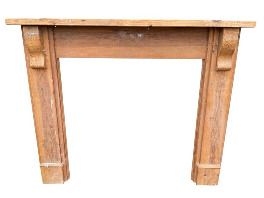 A Victorian style pine chimneypiece with thick mantelpiece supported by plain corbels, the jambs with moulded skirtings. (54in x 9in x 45.5in)