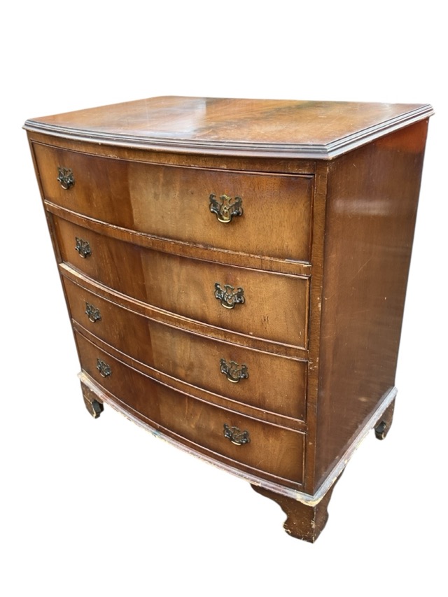 A bowfronted mahogany chest of three long drawers mounted with brass Georgian style handles, raised on bracket feet. (30in x 19.5in x 33in)