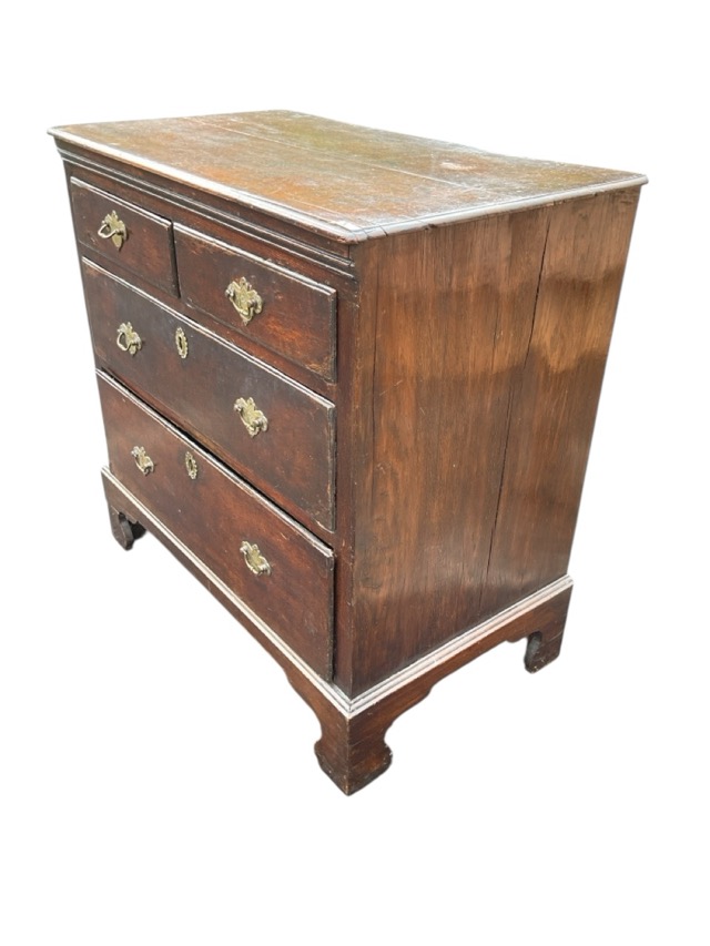A Georgian oak chest with two short and two long drawers mounted with brass handles & engraved escutcheons, raised on bracket feet. (32in x 18.5in x 32in)