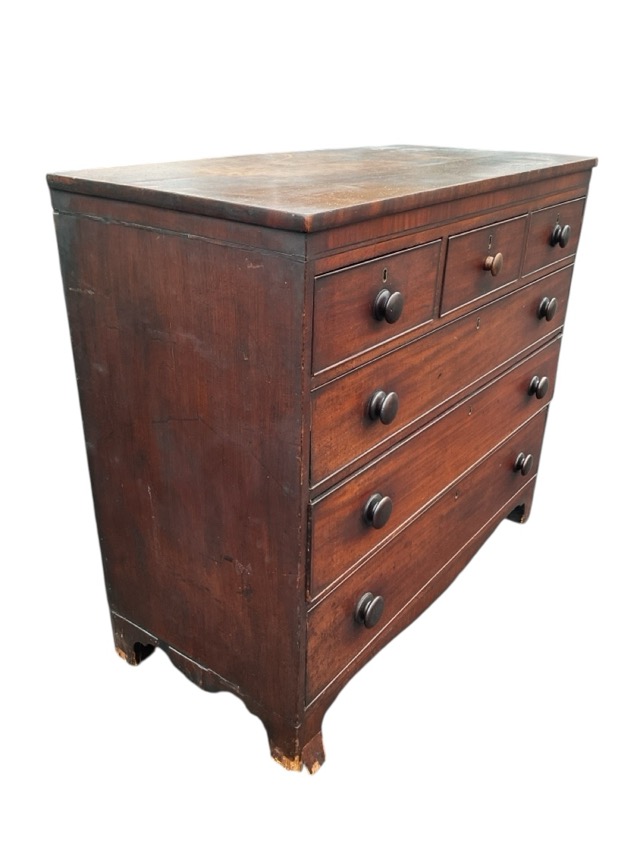 A 19th century mahogany chest, the frieze inlaid with ebony stringing, having three drawers above three long graduated drawers mounted with knobs, the shaped apron on bracket feet. (20.75in x 45.25in x 40in)