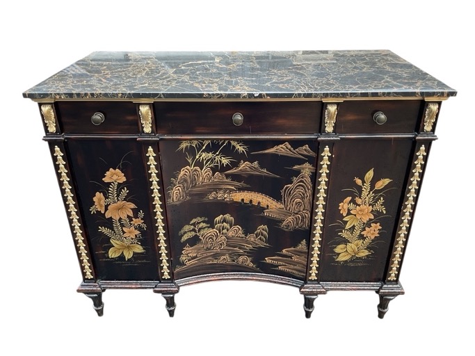 A reproduction ebonised gilt side cabinet having Breccia marble top above three frieze drawers and a concave chinoiserie landscape cupboard flanked by floral panels bordered by gilt bell type pilasters, raised on turned legs. (50in x 24.75in x 38in)
